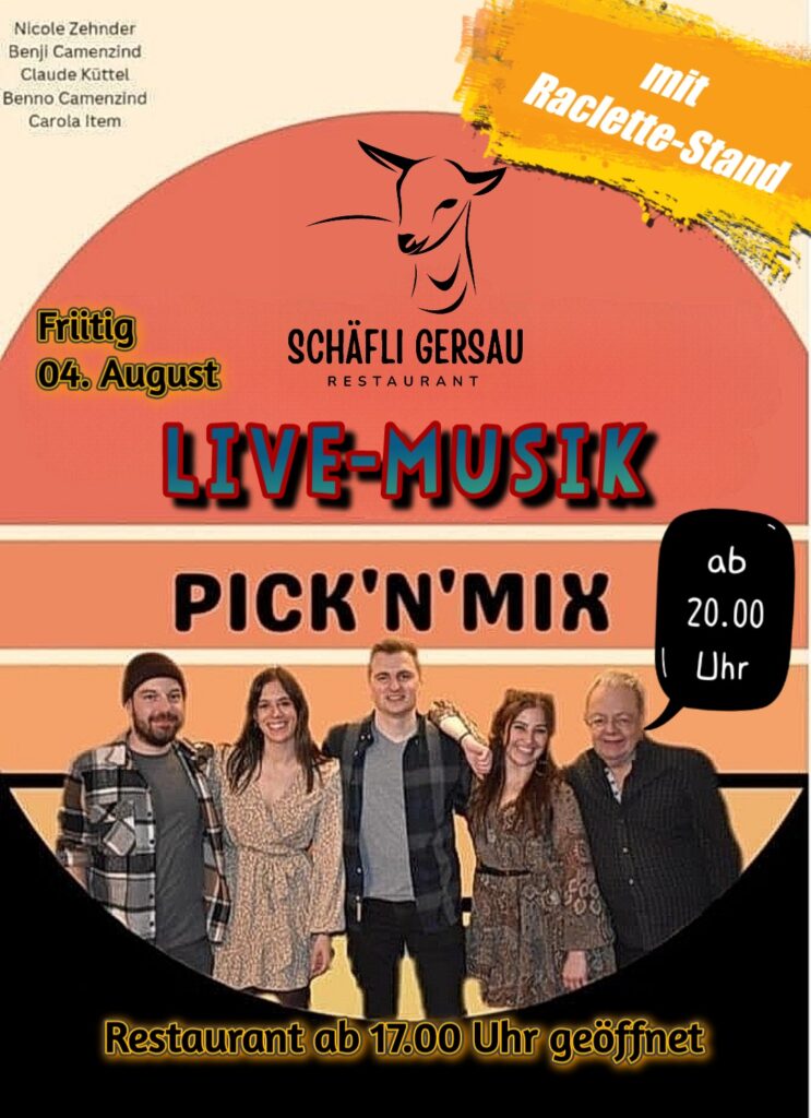 Die Gersauer Band PICK’N’MIX geben heute Abend ein Konzert im Schäfli-Gersau! Restaurant ab 17.00 Uhr geöffnet Konzert ab 20.00 Uhr im Schäfli-Saal