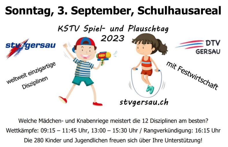 Die Mädchen und Knabenriegen aus dem ganzen Kanton Schwyz treffen sich auf dem Schulhausarela in der altfryen Republik zum Spiel- und Plauschtag. 280 Kinder und Jugendliche probieren an 12 unterschiedlichen Posten ihr Bestes zu geben. Dabei ist Teamwork, Geschicklichkeit, Ausdauer, Konzentration und Können gefragt. Die Disziplinen sind weltweit einzigartig und wurden vom Leiterteam des STV Gersau eigens für diesen Anlass ausgetüftelt. Für die Teilnehmer und Zuschauer betreibt die Damenriege eine leistungsstarke Festwirtschaft. Auch ein Soft-Ice-Stand ist vor Ort. Der kantonale Turnverband und die Gersauer Turnvereine freuen sich auf viele interessierte Zuschauer.