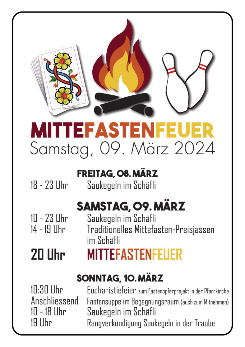 Umrahmt wird das Feuer am Wochenende wie üblich vom Saukegeln und Preisjassen. Gekegelt wird auf der altehrwürdigen Kegelbahn im Schäfli am Freitag (18 – 23 Uhr), Samstag (10 – 23 Uhr) und Sonntag (10 – 18 Uhr). Die Rangverkündigung findet am Sonntagabend um 19 Uhr im Restaurant Traube statt. Das Preisjassen (Bodentrumpf) findet am Samstagnachmittag von 14 bis 19 Uhr im Restaurant Schäfli statt.